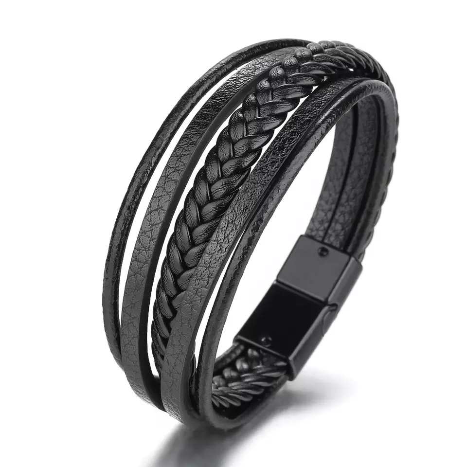 Das schwarze Leder schmiegt sich angenehm ums Handgelenk, während die geflochtenen Details Tiefe und Persönlichkeit verleihen. Kein Schnickschnack – nur klares Design und maskuline Eleganz.